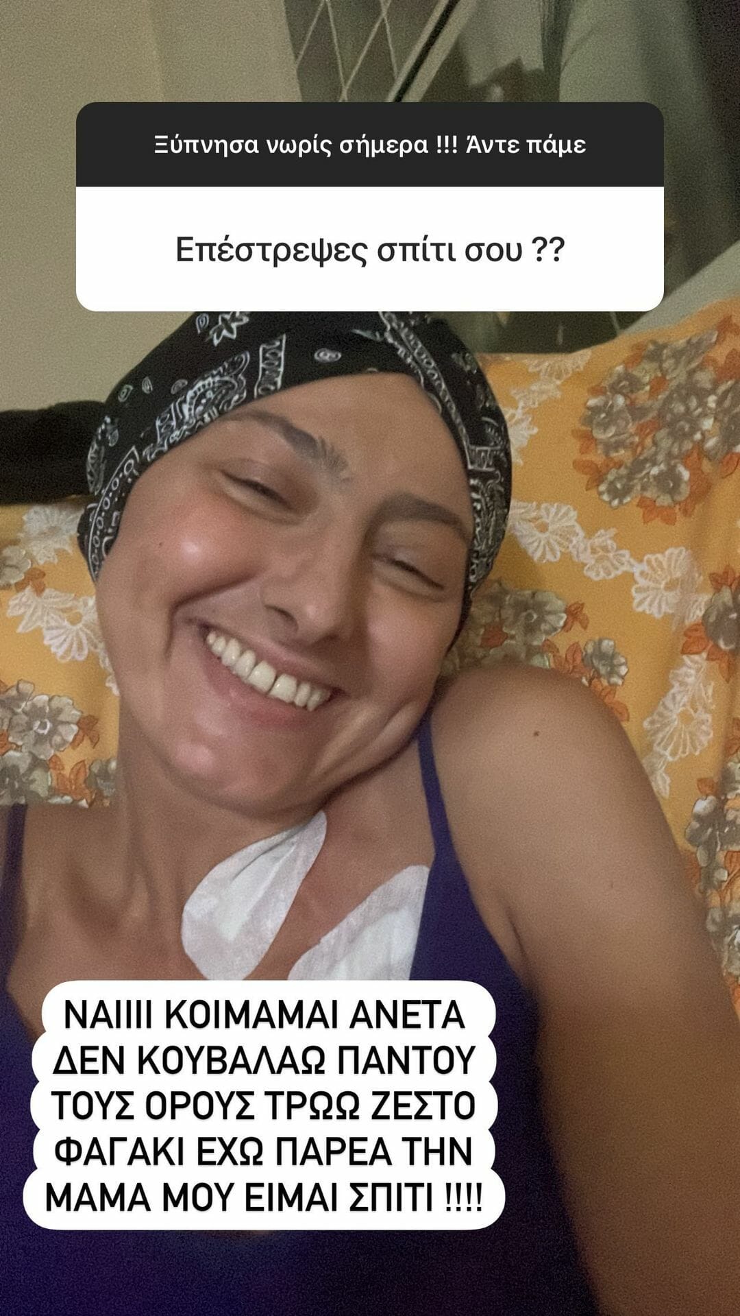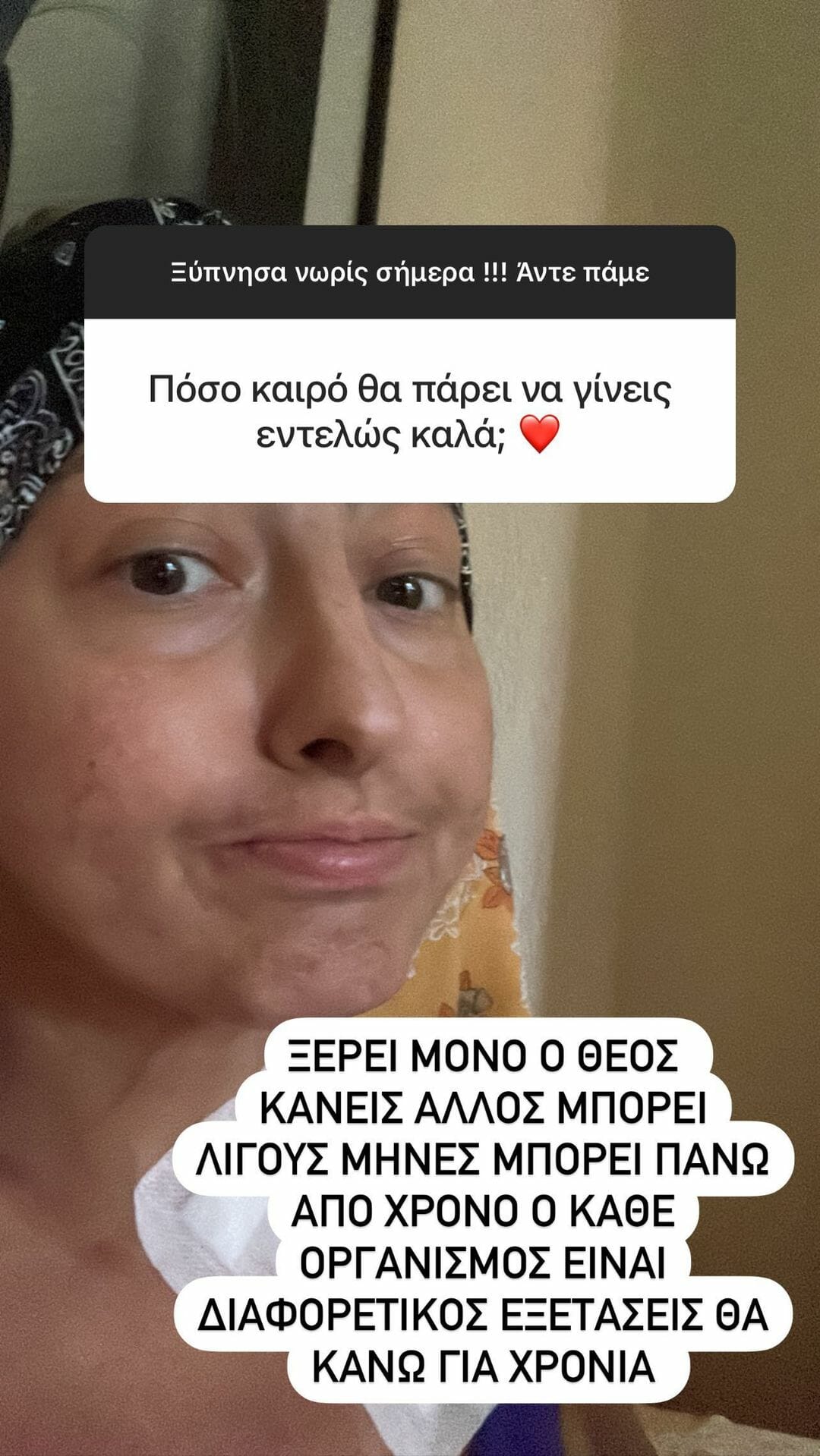 «Το κορίτσι είναι πολύ καλύτερα, απομόνωση στο σπίτι. Προσέχω πολύ και προχωράμε! Γενικά αισθάνομαι πολύ καλά αλλά πολύ κουρασμένη, το σώμα θέλει χρόνο για να συνυπάρξει με τον νέο μυελό. Ο καινούργιος μυελός καταλαμβάνει το σώμα μου και βγαίνουν κάποιες παρενέργειες… Στο σπίτι κοιμάμαι άνετα, δεν κουβαλάω παντού τους ορούς, τρώω ζεστό φαγάκι και έχω παρέα τη μάνα μου. Μόνο ο Θεός ξέρει πότε θα γίνω εντελώς καλά. Μπορεί λίγους μήνες, μπορεί πάνω από χρόνο. Ο κάθε οργανισμός είναι διαφορετικός, εξετάσεις θα κάνω για χρόνια».