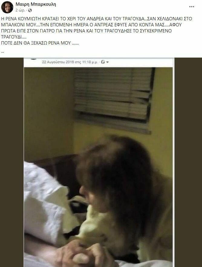 «Η ΡΕΝΑ ΚΟΥΜΙΩΤΗ ΚΡΑΤΑΕΙ ΤΟ ΧΕΡΙ ΤΟΥ ΑΝΔΡΕΑ ΚΑΙ ΤΟΥ ΤΡΑΓΟΥΔΑ…ΣΑΝ ΧΕΛΙΔΟΝΑΚΙ ΣΤΟ ΜΠΑΛΚΟΝΙ ΜΟΥ….ΤΗΝ ΕΠΟΜΕΝΗ ΗΜΕΡΑ Ο ΑΝΤΡΕΑΣ ΕΦΥΓΕ ΑΠΟ ΚΟΝΤΑ ΜΑΣ…..ΑΦΟΥ ΠΡΩΤΑ ΕΙΠΕ ΣΤΟΝ ΓΙΑΤΡΌ ΓΙΑ ΤΗΝ ΡΈΝΑ ΚΑΙ ΤΟΎ ΤΡΑΓΟΎΔΗΣΕ ΤΟ ΣΥΓΚΕΚΡΙΜΈΝΟ ΤΡΑΓΟΎΔΙ…..ΠΟΤΕ ΔΕΝ ΘΑ ΞΕΧΑΣΩ ΡΕΝΑ ΜΟΥ …», έγραψε η Μαίρη Μπάρκουλη.