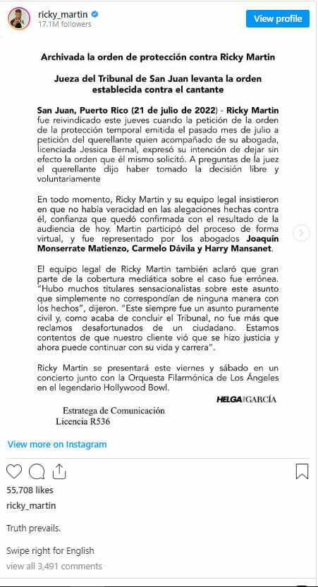 Τέλος μπήκε στη δικαστική περιπέτεια του Ρίκι Μάρτιν καθώς οι κατηγορίες που τον βάρυναν περί αιμομιξίας, αποσύρθηκαν.