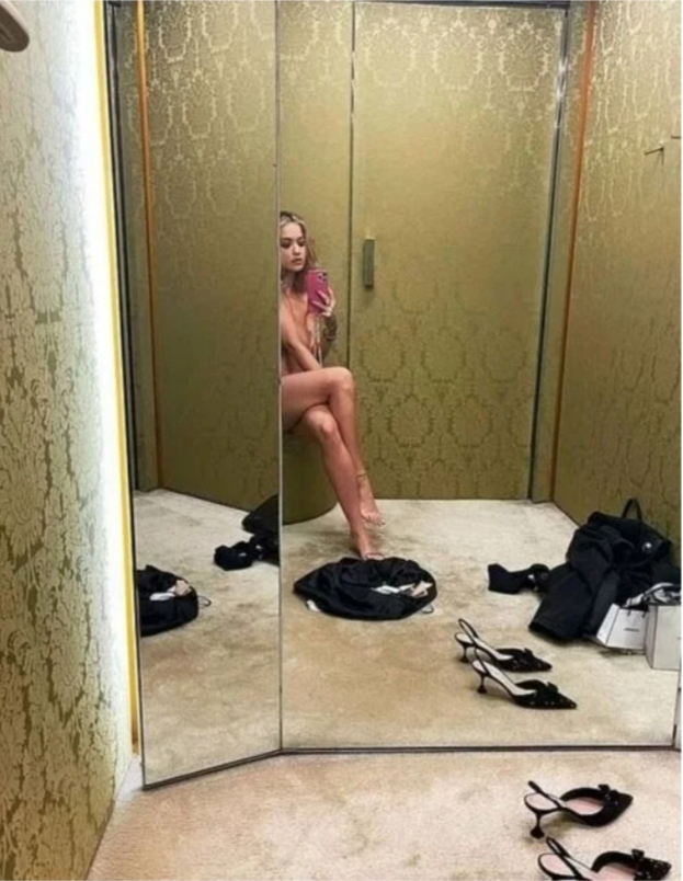 Ποζάρει χωρίς ρούχα μέσα στο δωμάτιό της ενώ στο πάτωμα υπάρχουν πεταμένα ρούχα και ένα ζευγάρι ψηλοτάκουνα mules.