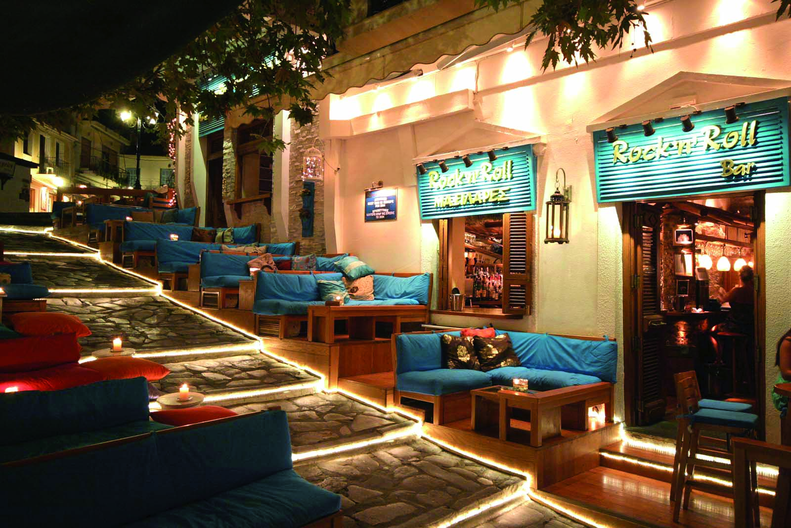 Το πρώτο μαγαζί που καθιέρωσε τις μαξιλάρες στο πέτρινο καλντερίμι στο παλιό λιμάνι της Σκιάθου, το 2001.