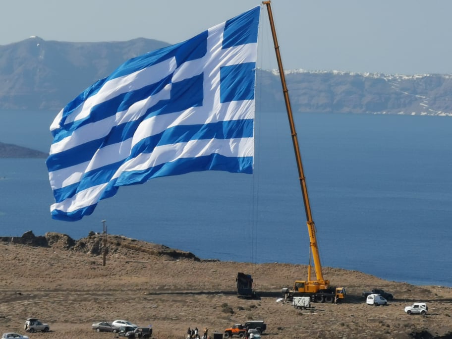Σαντορίνη: Ύψωσαν την μεγαλύτερη Ελληνική σημαία με γερανό