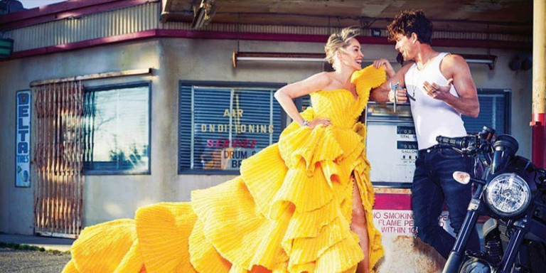Σε άλλο στιγμιότυπο από την φωτογράφηση, η Σάρον Στόουν φορά ένα καναρινί φόρεμα με ένα μεγάλο κόψιμο στο μπροστινό μέρος και μια μακριά ruffles ουρά ενώ δείχνει πολύ χαρούμενη συνομιλώντας με τον νεαρό άνδρα που φορά ένα λευκό t-shirt και τζιν παντελόνι, με το σκηνικό πίσω τους να θυμίζει παλιό βενζινάδικο.