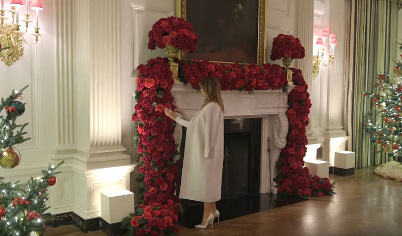 Εκθαμβωτικλη με σικ εμφάνιση και δωδεκάποντα η Μελλανια Τραμπ βάζει τισ τελευταλιες πινελιλες στην διακόσμιση του Λευκού Οίκου. Τον διάκοσμο που επέλεξε για φέτος παρουσίασε μεσα από ένα εορταστικό βίντεο που την δείχνει να προσθέτει τις τελευταίες πινελιές σε ένα ντεκόρ που ονομάστηκε «Το Αμερικανικό Πνεύμα». Στο βίντεο διάρκειας περίπου ενός λεπτού που δημοσιεύτηκε στον επίσημο λογαριασμό της στο Twitter αλλά και στο κανάλι του Λευκού Οίκου στο YouTube, η Πρώτη Κυρία φορώντας ένα κρεμ παλτό, ταιριαστό φόρεμα και λευκές 12ποντες γόβες στιλέτο, απολαμβάνει την δουλειά των εθελοντών που βοήθησαν στην διακόσμηση της επίσημης κατοικίας. Στην ανάρτησή της, η Μελάνια Τραμπ, έγραψε: «Το Αμερικανικό Πνεύμα λάμπει στον Λευκό Οίκο. Χαίρομαι που μοιράζομαι αυτή την πανέμορφη επίδειξη πατριωτισμού με όλους εσάς και είμαι ενθουσιασμένη που θα ζήσουμε την ομορφιά των Χριστουγέννων». Όσο για την φετινή διακόσμηση, η λάμψη και η πολυτέλεια ήταν και πάλι διάχυτα παντού, με το ψεύτικο χιόνι, τα διακοσμητικά λευκά αστέρια που κρέμονται από το ταβάνι, τα στολίδια με τα χρώματα της αμερικανικής σημαίας και ένα πελώριο ημερολόγιο που μετρά αντίστροφα τις ημέρες για τα Χριστούγεννα. Στα πλάνα, φαίνεται επίσης πως τουλάχιστον ένας από τους διαδρόμους του Λευκού Οίκου είναι στολισμένος με λευκές αιωρούμενες χιονονιφάδες ενώ εντυπωσιακός είναι και ο διάκοσμος από κόκκινα τριαντάφυλλα γύρω από ένα τζάκι. Η Μελάνια Τραμπ και το προσωπικό της εργάστηκαν επί μήνες – οι ετοιμασίες ξεκίνησαν από το καλοκαίρι – για τον στολισμό του Λευκού Οίκου με την ελπίδα πως φέτος δεν θα ακουστούν αρνητικά σχόλια.