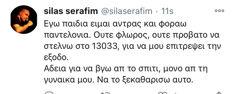 Δεν σταματά να προκαλεί ο γνωστός stand up κωμικός Σίλας Σεραφείμ. Σε δημοσίευσή του στο twitter αποκάλυψε ότι δεν χρησιμοποιεί τα μηνύματα στο νούμερο 13033 για τις εξόδους του από το σπίτι, όπως προβλέπεται λόγω των περιοριστικών μέτρων για την πανδημία. Όπως ο ίδιος ανέφερε δεν είναι «ούτε φλώρος, ούτε πρόβατο»…