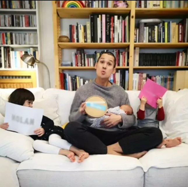 Ο Σωτήρης Κοντιζάς ποζάρει καθισμένος στον καναπέ του σαλονιού του κρατώντας στην αγκαλιά του το νεογέννητο γιο του, ενώ τα άλλα δύο παιδιά του βρίσκονται στο πλάι του.