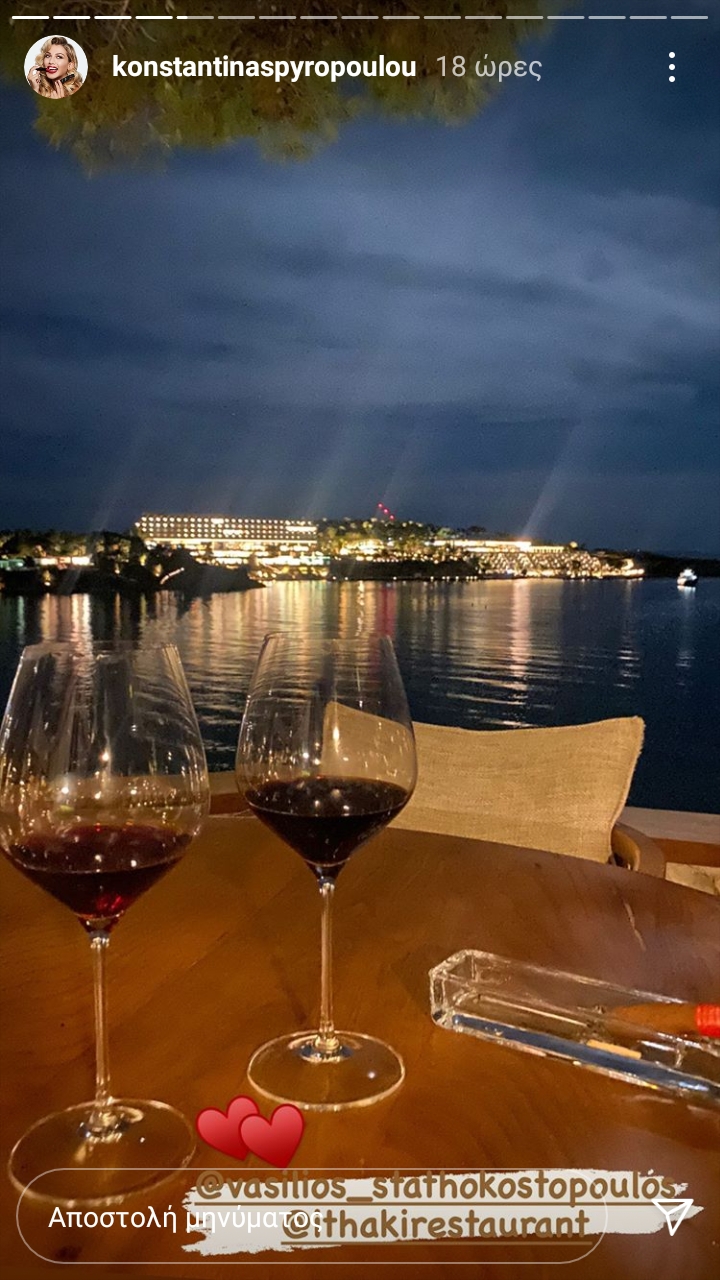Η Κωνσταντίνα Σπυροπούλου ανέβασε στην ιστορία στο ινσταγκραμ της μια φωτογραφία καθώς πήγε μαζί με τον σύντροφο της, Βασίλη Σταθοκωστόπουλο για κρασί στην παραμυθένια Ιθάκη. Στην φωτογραφία , λοιπόν, παρατηρούμε πέρα από το μαγευτικό τοπίο τα δύο ποτήρια με το κρασί και δυο κόκκινες καρδούλες που πρόσθεσε η παρουσιάστρια στην ιστορία της. Να σημειώσουμε ότι πριν από λίγες μέρες η Κωνσταντίνα ανέβασε την πρώτη κοινή φωτογραφία με τον σύντροφο της από την Ιθάκη.
