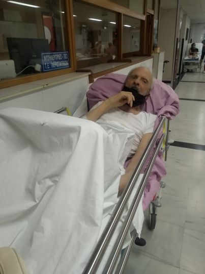 Στη φωτογραφία που δημοσίευσε στο προσωπικό της προφίλ στο facebook, ο Σπύρος Φωκάς απεικονίζεται εμφανώς καταπονημένος σε ένα φορείο, στον διάδρομο του νοσοκομείου.