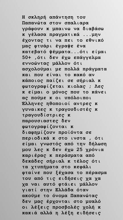 Λες και είμαι ο μόνος που το κάνει, ας πούμε, και οι υπόλοιποι Έλληνες ηθοποιοί, άντρες και γυναίκες και τραγουδίστριες και παρουσιαστές δεν φωτογραφίζονται και διαφημίζουν προϊόντα σε περιοδικά και στο insta, ότι είμαι γνωστός από τη δήλωσή μου λες και δεν έχω 25 χρόνια καριέρας και περάσματα από δεκάδες σίριαλ και τέλος ότι τα χτυπήματα στο κεφάλι φταίνε που ξέχασα το πέρασμά του από τις ειδήσεις. Χα χα χα ναι, αυτό φταίει μάλλον γιατί στην Ελλάδα όταν ακούμε ένα όνομα Παπανώτας δεν μας έρχονται στο μυαλό οι λέξεις προσβολές, χολή και κακία αλλά η λέξη ειδήσεις».