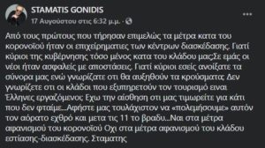 “Από τους πρώτους που τήρησαν επιμελώς τα μέτρα κατά του κορονοϊού ήταν οι επιχειρηματίες των κέντρων διασκέδασης. Γιατί κύριοι της κυβέρνησης τόσο μένος κατά του κλάδου μας; Σε εμάς οι νέοι ήταν ασφαλείς με αποστάσεις. Γιατί κύριοι εσείς ανοίξατε τα σύνορα μας ενώ γνωρίζατε ότι θα αυξηθούν τα κρούσματα; Δεν γνωρίζετε ότι οι κλάδοι που εξυπηρετούν τον τουρισμό είναι Έλληνες εργαζόμενοι; Έχω την αίσθηση ότι μας τιμωρείτε για κάτι που δεν φταίμε…Αφήστε μας τουλάχιστον να «πολεμήσουμε» αυτόν τον αόρατο εχθρό και μετά τις 11 το βράδυ…Ναι στα μέτρα αφανισμού του κορονοϊού όχι στα μέτρα αφανισμού του κλάδου εστίασης-διασκέδασης»