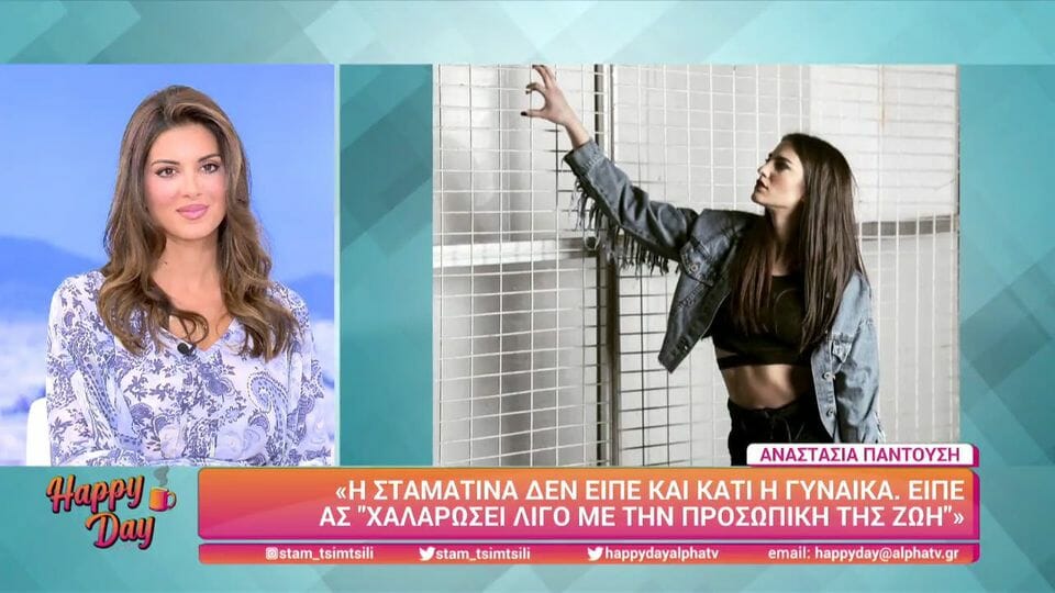Και η Σταματίνα Τσιμτσιλή απάντησε στον αέρα της εκπομπής, Happy Day: «Θέλω να πω, έβλεπα την Αναστασία Παντούση και στη συνέντευξη της στο Open Weekend και ήταν πολύ ειλικρινής και γλυκιά. Και την έβλεπα στο Κόκκινο Ποτάμι και είναι τόσο ταλαντούχα.