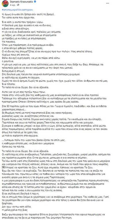 Θέση για τις καταγγελίες που έχουν έρθει στο φως σχετικά με τον Γιώργο Κιμούλη πήρε και ο μουσικοσυνθέτης Σταμάτης Κραουνάκης. Με ανάρτησή του στο Facebook ο Σταμάτης Κραουνάκης αναφέρει πως με τον Γιώργο Κιμούλη είναι φίλοι περίπου 50 χρόνια σημειώνοντας πως «δε θυμάμαι ποτέ μα ποτέ περιστατικά βίας και κακεντρέχειας».