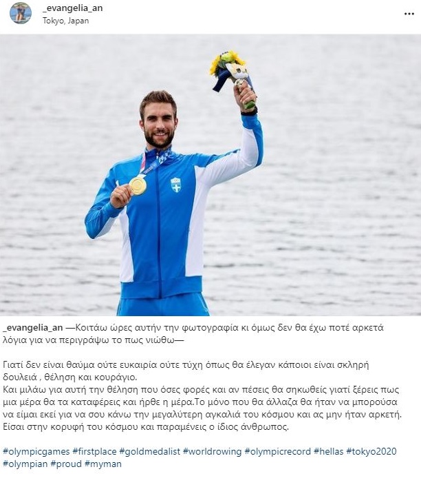 Είσαι στην κορυφή του κόσμου και παραμένεις ο ίδιος άνθρωπος» έγραψε η σύντροφος του Στέφανου Ντούσκου, Ευαγγελία Αναστασιάδου. Η οποία είναι επίσης επαγγελματίας αθλήτρια και ασχολείται με την κωπηλασία.