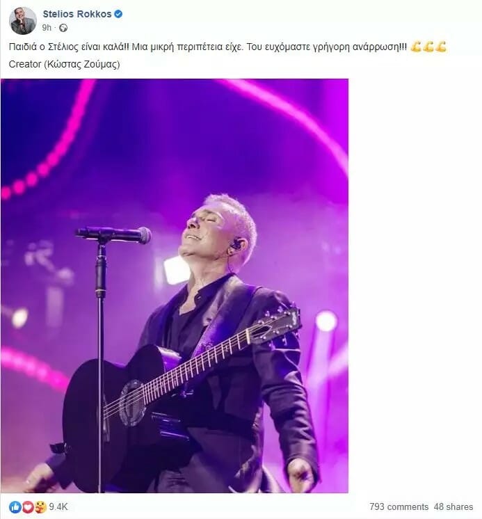 Λίγο πριν τα μεσάνυχτα και αφού η είδηση είχε ήδη κάνει τον γύρο του διαδικτύου, ο στενός συνεργάτης του τραγουδιστή, Κώστας Ζούμας, με ανάρτηση στον επίσημο λογαριασμό του Στέλιου Ρόκκου στο Facebook, ανέφερε πως ο καλλιτέχνης είναι καλά και πως απλώς είχε μια μικρή περιπέτεια με την υγεία του.