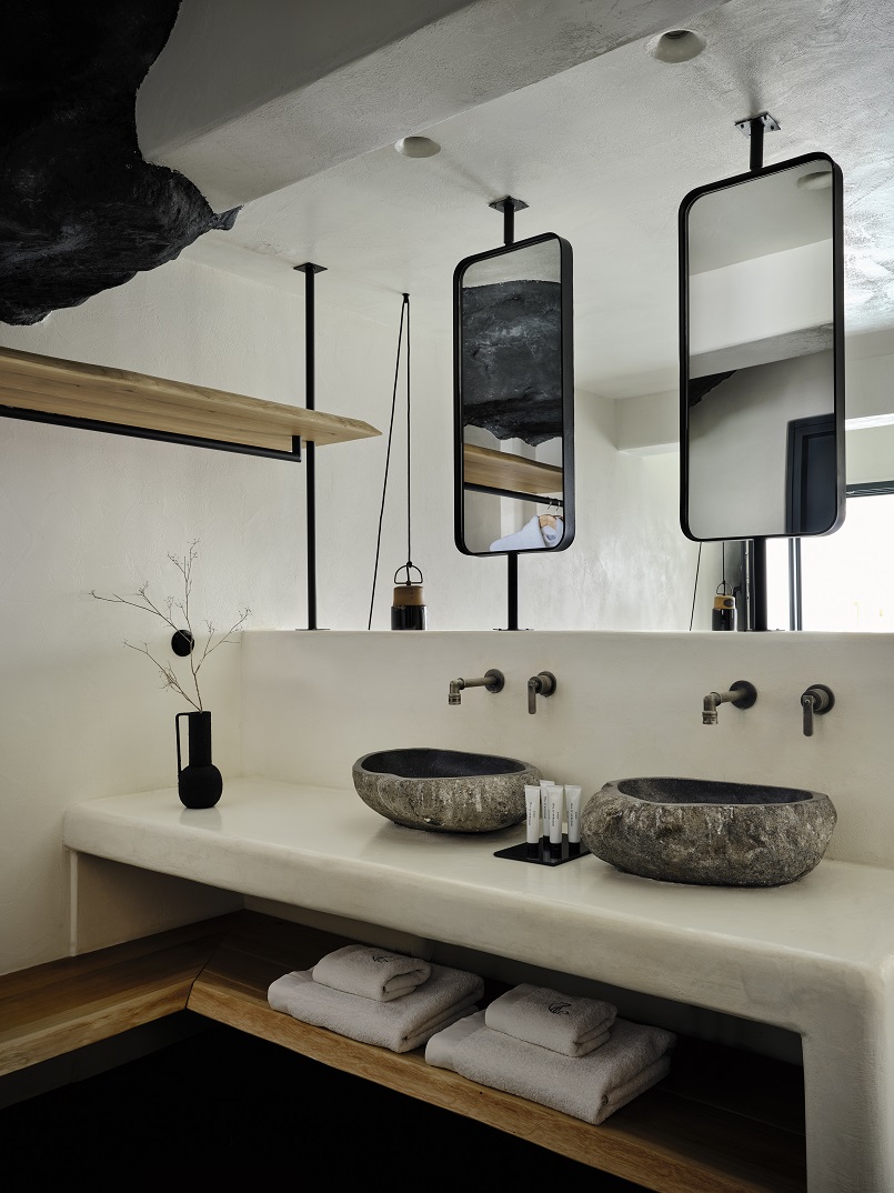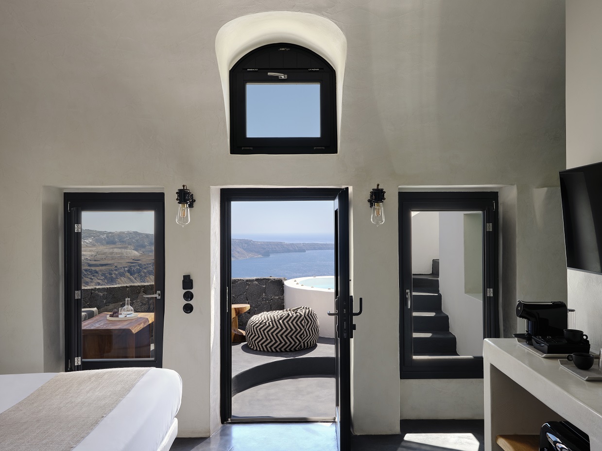 Τα εντυπωσιακά υδρομασάζ προσθέτουν μια ιδιαίτερη γοητεία, συνδέοντας αρμονικά τους εσωτερικούς και εξωτερικούς χώρους. Οι χρωματικές αποχρώσεις του ξενοδοχείου, εμπνευσμένες από το ηφαιστειακό έδαφος του νησιού, αντικατοπτρίζουν την φυσική ομορφιά της Σαντορίνης. Το εστιατόριο Rocca Nera προσφέρει τοπικές γαστρονομικές απολαύσεις με μια σύγχρονη πινελιά.