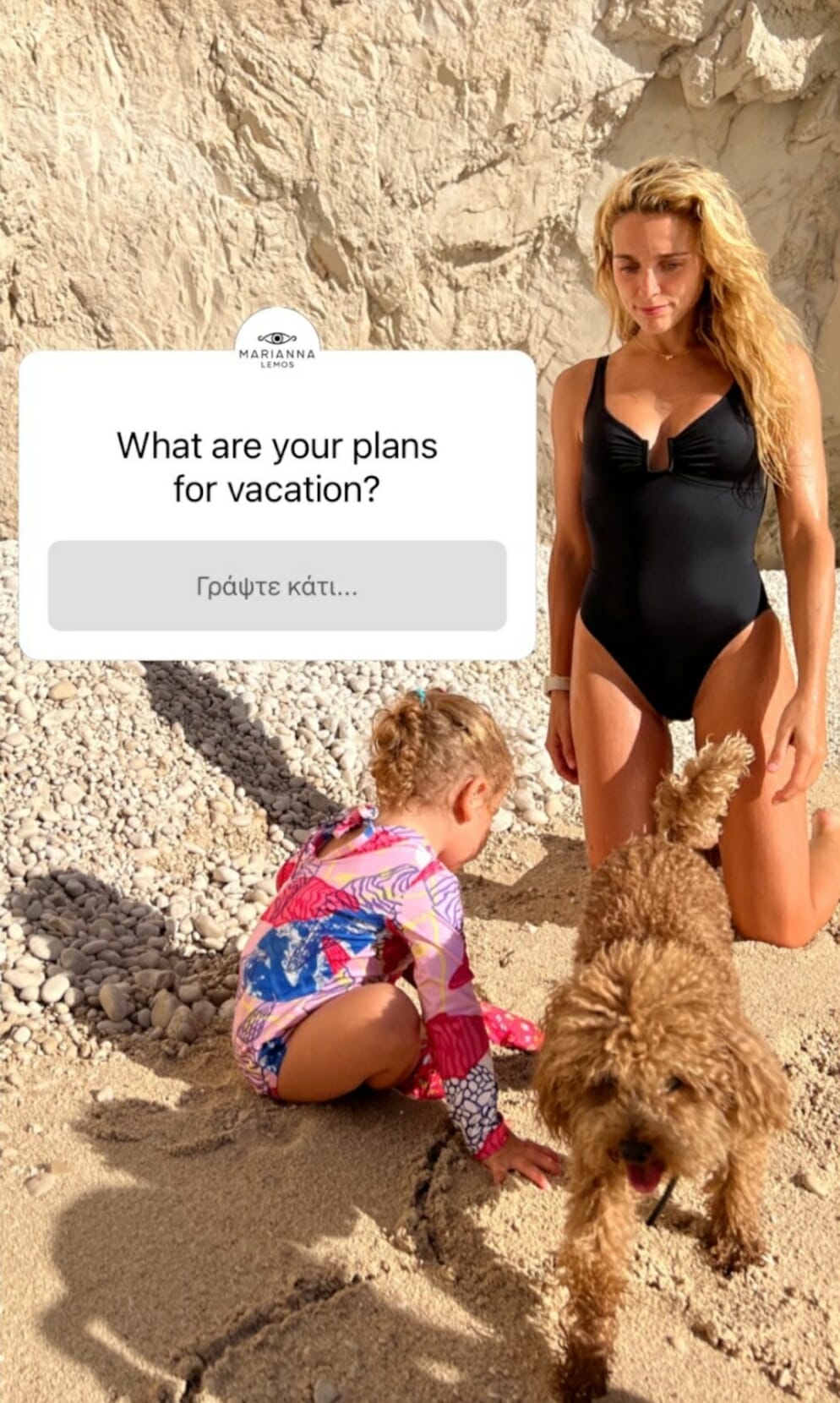 Η Μαριάννα-Γουλανδρή Λαιμού δημοσίευσε στα instagram stories της δύο φωτογραφίες από το ελληνικό νησί, όπου στη μία την βλέπουμε μαζί με την κόρη της στην παραλία και τον χαριτωμένο σκύλο τους.