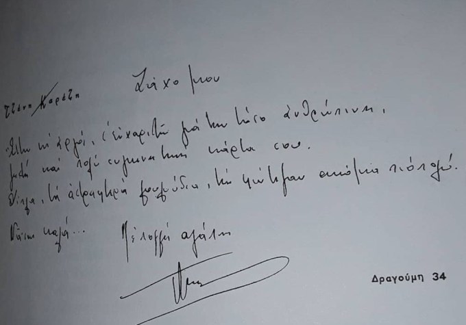 Η Τζένη Καρέζη έγραψε το σημείωμα λίγους μήνες πριν φύγει από τη ζωή, χτυπημένη από την επάρατη νόσο. Νωρίτερα, ο Ζάχος Χατζηφωτίου της είχε στείλει λευκά τριαντάφυλλα και μία κάρτα για εκείνη. Tο χειρόγραφο σημείωμα της Καρέζη: