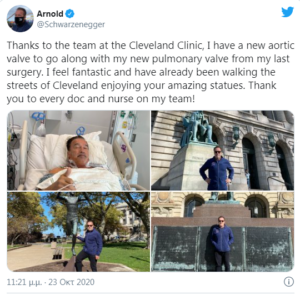 “Χάρη στο ιατρικό προσωπικό της κλινικής του Cleveland έχω μια νέα βαλβίδα αορτής συμβατή με τη νέα μου πνευμονική βαλβίδα από την τελευταία μου χειρουργική επέμβαση. Αισθάνομαι φανταστικά και έχω ήδη περπατήσει στους δρόμους του Cleveland. Ευχαριστώ κάθε γιατρό και νοσοκόμα ξεχωριστά», έγραψε χαρακτηριστικά ο Άρνολντ Σβαρτσενέγκερ.