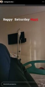 Η παρουσιάστρια και ραδιοφωνική παραγωγός δημοσίευσε στον προσωπικό της λογαριασμό στο Instagram μια φωτογραφία, που απεικονίζει τα πόδια της στο κρεβάτι του νοσοκομείου και στο βάθος να βρίσκεται ένας ορός.