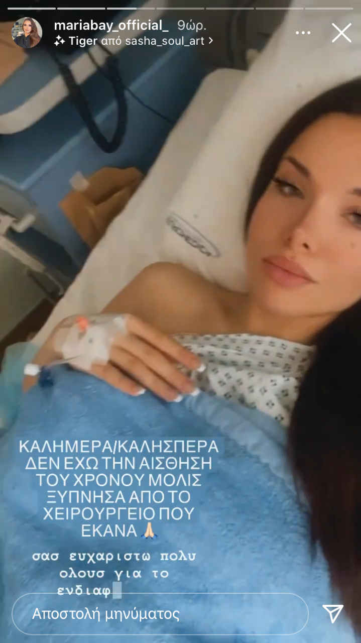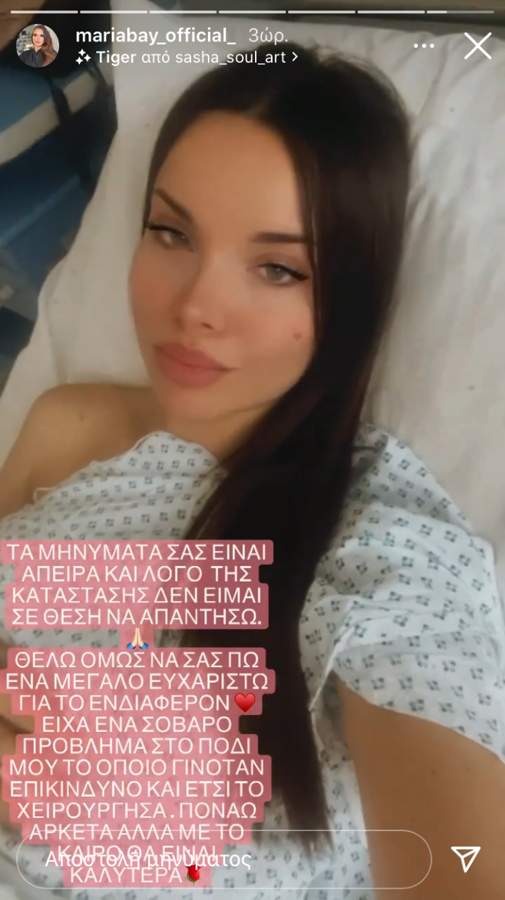«Τα μηνύματά σας είμαι άπειρα και λόγο της κατάστασης δεν είμαι σε θέση να απαντήσω. Θέλω όμως να σας πω ένα μεγάλο ευχαριστώ για το ενδιαφέρον. Είχα ένα σοβαρό πρόβλημα στο πόδι μου, το οποίο γινόταν επικίνδυνο και έτσι το χειρούργησα. Πονάω αρκετά αλλά με τον καιρό θα είμαι καλύτερα», έγραψε η Μαρία Μπέη στο instagram.