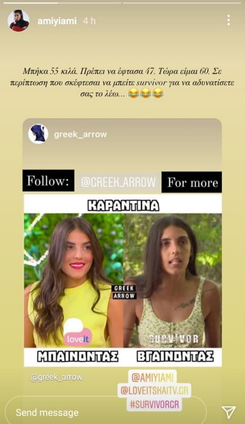 «Μπήκα 55 κιλά. Πρέπει να έφτασα 47. Τώρα είμαι 60. Σε περίπτωση που σκέφτεστε να μπείτε στο survivor για να αδυνατίσετε σας το λέω».