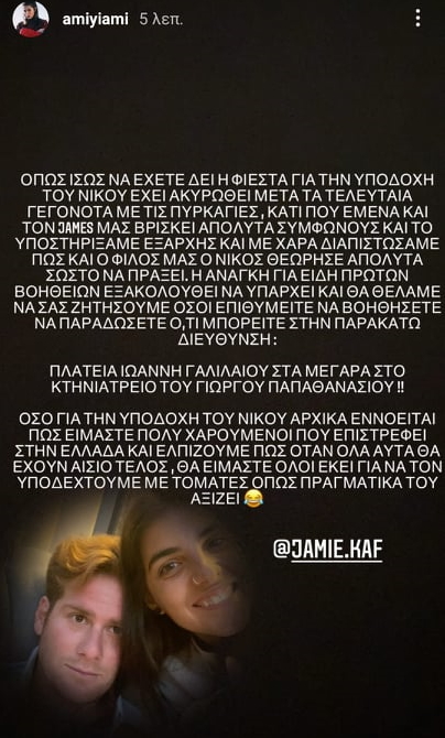 «Όπως ίσως να έχετε δει η φιέστα για την υποδοχή του Νίκου έχει ακυρωθεί. Mετά τα τελευταία γεγονότα με τις πυρκαγιές. Κάτι που εμένα και τον James μας βρίσκει απόλυτα σύμφωνους και το υποστηρίξαμε εξαρχής. Και με χαρά διαπιστώσαμε πως και ο φίλος μας ο Νίκος θεώρησε απόλυτα σωστό να πράξει.