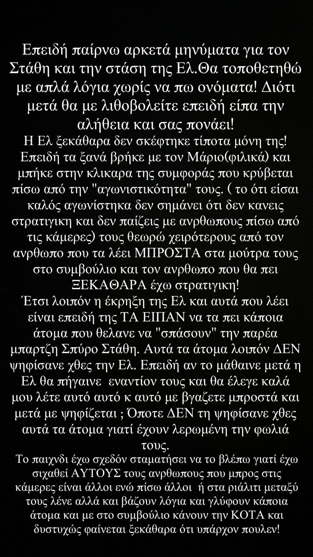 «Έτσι λοιπόν η έκρηξη της Ελευθερίας και αυτά που λέει είναι επειδή της τα είπαν να τα πει κάποια άτομα που θέλανε να σπάσουν την παρέα Μπάρτζη, Σπύρου, Στάθη. Αυτά τα άτομα λοιπόν δεν ψηφίσανε χθες την Ελευθερία. Επειδή αν το μάθαινε μετά η Ελευθερία θα πήγαινε εναντίον τους και θα έλεγε καλά μου λέτε “αυτό, αυτό και αυτό, με βγάζετε μπροστά και μετά με ψηφίζετε;” Οπότε δεν τη ψηφίσανε χθες αυτά τα άτομα γιατί έχουν λερωμένη τη φωλιά τους.