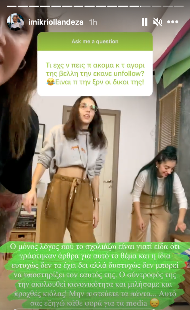 “Ο μόνος λόγος που το σχολιάζω είναι γιατί είδα ότι γράφτηκαν άρθρα για αυτό το θέμα και η ίδια ευτυχώς δεν τα έχει δει, αλλά δυστυχώς δε μπορεί να υποστηρίξει τον εαυτό της. Ο σύντροφος της την ακολουθεί κανονικότατα και μιλήσαμε και προχθες κιολας! Μην πιστεύετε τα πάντα…Αυτό σας εξηγώ κάθε φορά για τα media”, έγραψε χαρακτηριστικά.