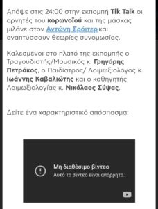 Ένα πραγματικό θρίλερ εξελίσσεται στις εγκαταστάσεις του Alpha τις βραδινές ώρες σχετικά με την απαγόρευση μετάδοσης της εκπομπής του Αντώνη Σρόιτερ Tik Talk… με θέμα συνωμοσιολογίες και αρνητές του κορονοιου.