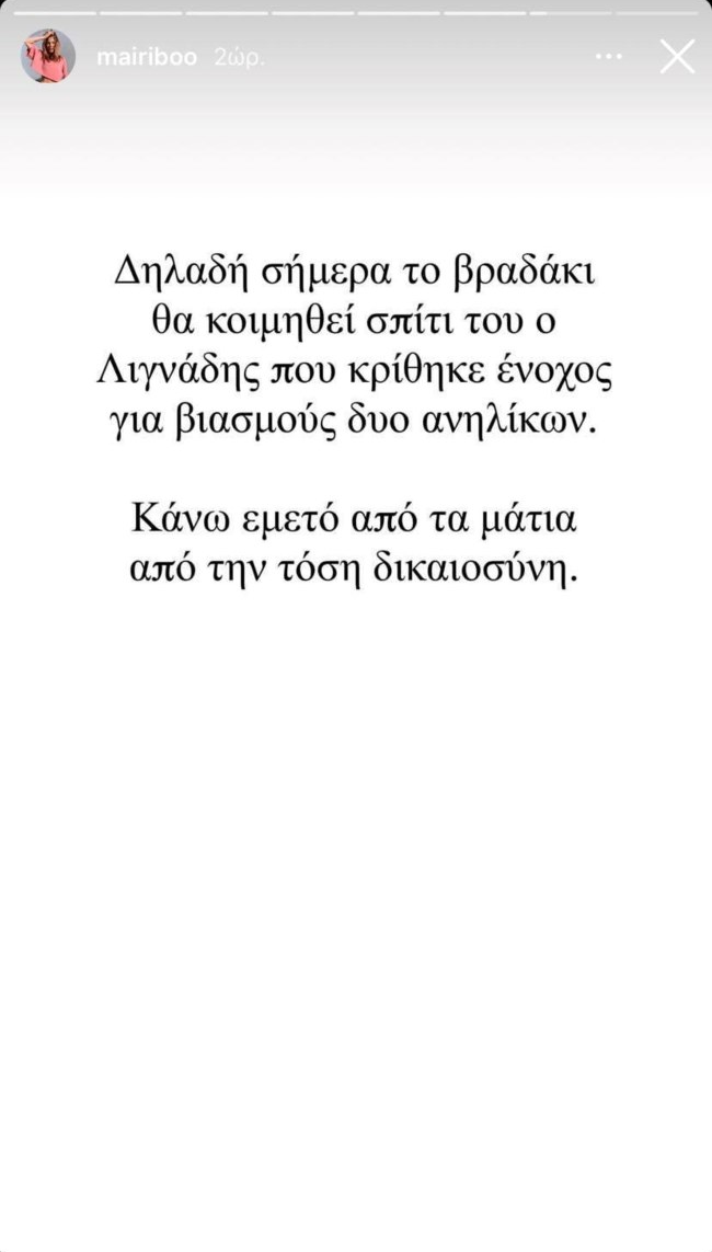 «Δηλαδή σήμερα το βραδάκι θα κοιμηθεί σπίτι του ο Λιγνάδης, που κρίθηκε ένοχος για βιασμούς δύο ανηλίκων. Κάνω εμετό από τα μάτια από την τόση δικαιοσύνη», έγραψε στον προσωπικό της λογαριασμό στο instagram η Μαίρη Συνατσάκη.