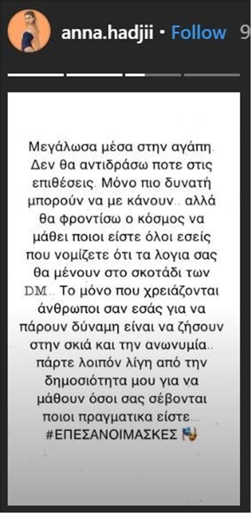 Η ίδια λίγο μετά την αποχώρησή της δημοσίευσε στα stories της τα υβριστικά σχόλια που δέχτηκε απαντώντας σχετικά: «Μεγάλωσα μέσα στην αγάπη. Δεν θα αντιδράσω ποτέ στις επιθέσεις. Μόνο πιο δυνατή μπορεί να με κάνουν. Αλλά θα φροντίσω ο κόσμος να μάθει ποιοι είστε όλοι εσείς που νομίζετε ότι τα λόγια σας θα μείνουν στο σκοτάδι των DM. To μόνο που χρειάζονται άνθρωποι σαν κι εσάς για να πάρουν δύναμη, είναι να ζήσουν στη σκιά και την ανωνυμία. Πάρτε λοιπόν λίγη από τη δημοσιότητά μου για να μάθουν όσοι σας σέβονται ποιοι πραγματικά είστε. Έπεσαν οι μάσκες».