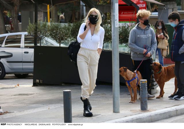 Φαίη Σκορδά: με τον καφέ της στο χέρι και φορώντας μάσκα προστασίας στο Κολωνάκι