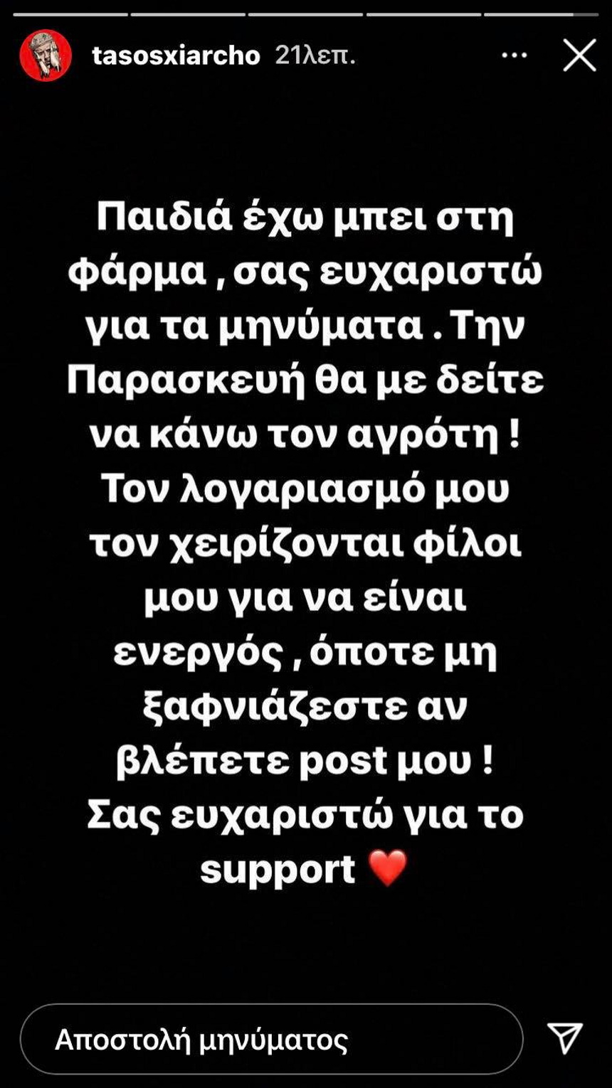 «Παιδιά έχω μπει στη φάρμα, σας ευχαριστώ για τα μηνύματα. Την Παρασκευή θα με δείτε να κάνω τον αγρότη.