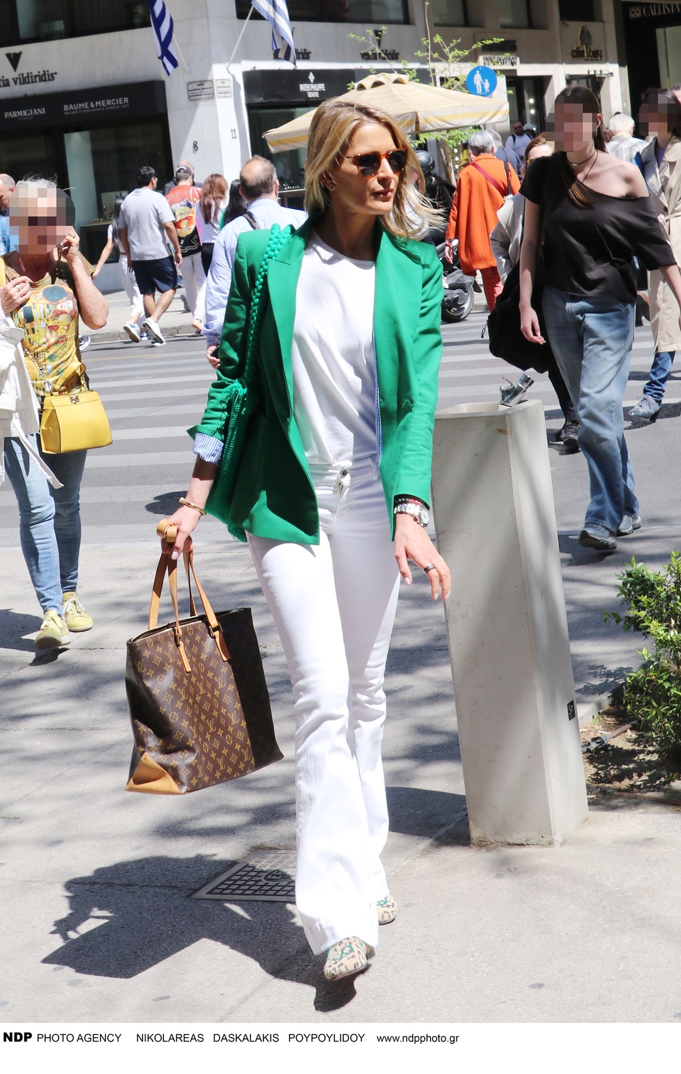 Η ίδια ήταν στιλάτη όπως πάντα, με λευκό παντελόνι και τοπ και ένα πράσινο σακάκι.