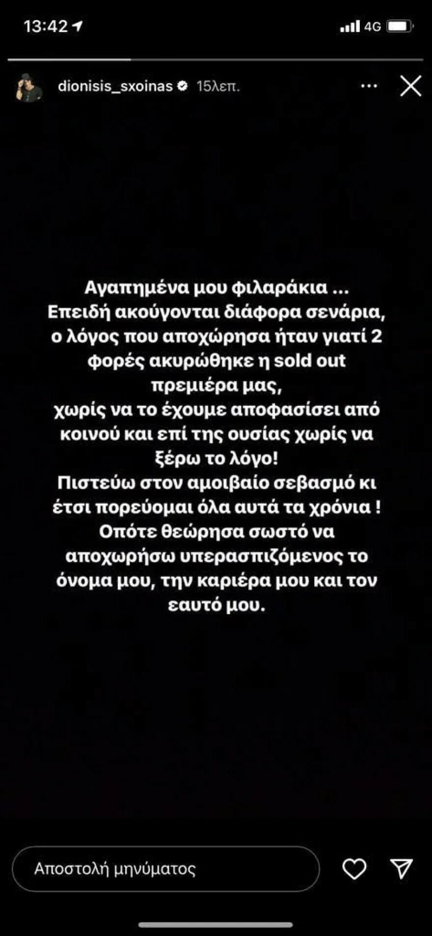 Τελικά, το μεσημέρι της Παρασκευής με μια ανάρτηση του έδωσε τη δική του εξήγηση για την απόφαση του γράφοντας: «Αγαπημένα μου φιλαράκια επειδή ακούγονται διάφορα σενάρια, ο λόγος που αποχώρησα ήταν γιατί δυο φορές ακυρώθηκε η sold out πρεμιέρα μας, χωρίς να ξέρω το λόγο! Πιστεύω στον αμοιβαίο σεβασμό κι έτσι πορεύομαι όλα αυτά τα χρόνια! Οπότε θεώρησα σωστό να αποχωρήσω υπερασπιζόμενος το όνομα μου, την καριέρα μου και τον εαυτό μου».
