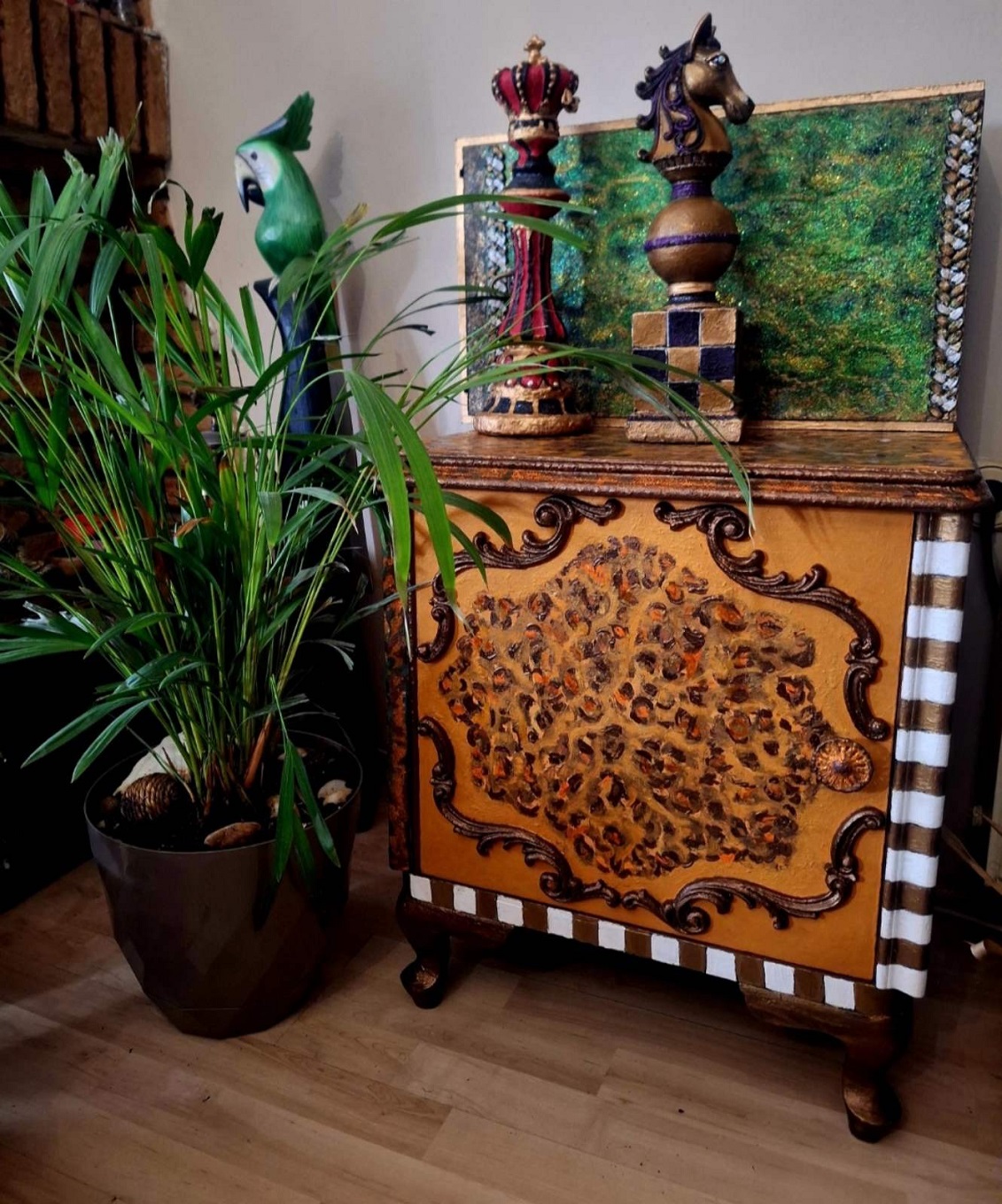 Τα υλικά που χρησιμοποιώ είναι άοσμα με βάση το νερό, όπως χρώματα κιμωλίας, υβριδικά και μεταλλικά χρώματα. Για το φινίρισμα εφαρμόζω κερί μέλισσας, βερνίκι νερού και υγρό γυαλί. Μου αρέσει πολύ να διακοσμώ με κρύσταλλα, πέτρες, φύλλο χρυσού, σκόνη χρυσού, διάφορες άλλες χρωματιστές σκόνες και ξυλογλυπτά. Είμαι λάτρης του όμορφου, του διαφορετικού και του μοναδικού. Μου αρέσει το ξύλο σαν βάση, είναι ζωντανός οργανισμός και δέχεται φιλικά τα χρώματα πάνω του. Με τη μοναδικότητά και την ποικιλομορφία των έργων μου, φροντίζω να ταιριάξουν σε κάθε σπίτι και επαγγελματικό χώρο, όπως ξενοδοχείο, bistro, εστιατόριο, καφετέρια, hairsalon, δίνοντας κουλτούρα και ιδιαιτερότητα στο περιβάλλον που τους αρμόζει.