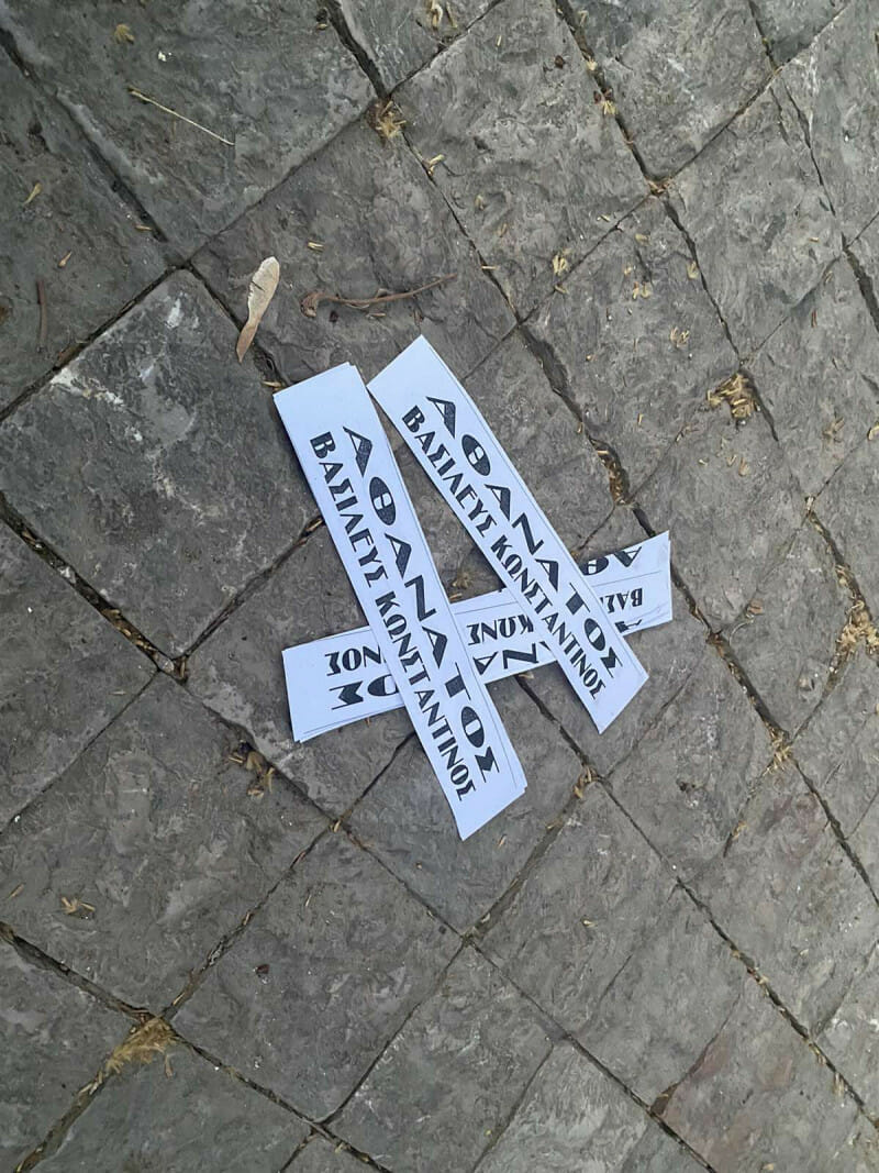 Kάποιοι από τους παριστάμενους πέταξαν και τρικάκια, τα οποία έγραφαν «αθάνατος βασιλεύς Κωνσταντίνος».