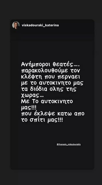 Όπως αποκάλυψαν με ανάρτησή τους στο Instagram, ο γνωστός ηθοποιός Θανάσης Βισκαδουράκης και η γυναίκα του, Κατερίνα Γιώτα, άγνωστοι έκλεψαν το αμάξι τους, το οποίο βρισκόταν κάτω από το σπίτι τους.