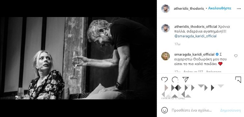 Αυτή τη φορά, ο Θοδωρής Αθερίδης θέλησε να ευχηθεί στην αγαπημένη του με μία κοινή φωτογραφία τους από το θέατρο.