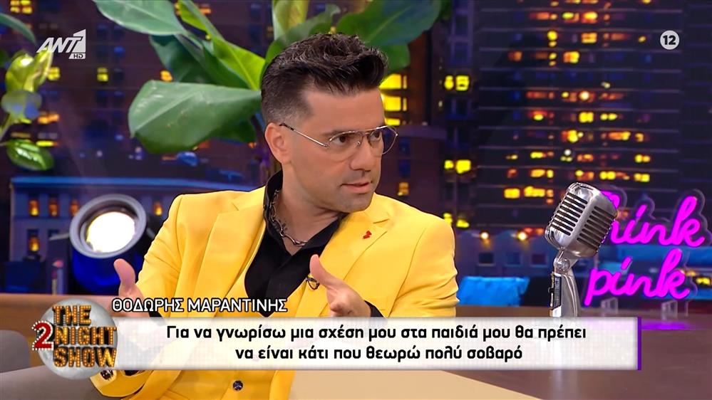 Ο Θοδωρής Μαραντίνης βρέθηκε καλεσμένος στο πλατό του “The 2Night Show” το βράδυ της Τρίτης (04/06). Ο τραγουδιστής και front man των “Onirama” μίλησε, μεταξύ άλλων, για τις αλλαγές, αλλά και τις προτεραιότητες, που έχει θέσει πλέον στην προσωπική του ζωή. Ο ίδιος εξήγησε πώς είναι η καθημερινότητα με τους γιους του, ενώ αναφέρθηκε και στο διαζύγιό του από τη Σίσσυ Χρηστίδου.