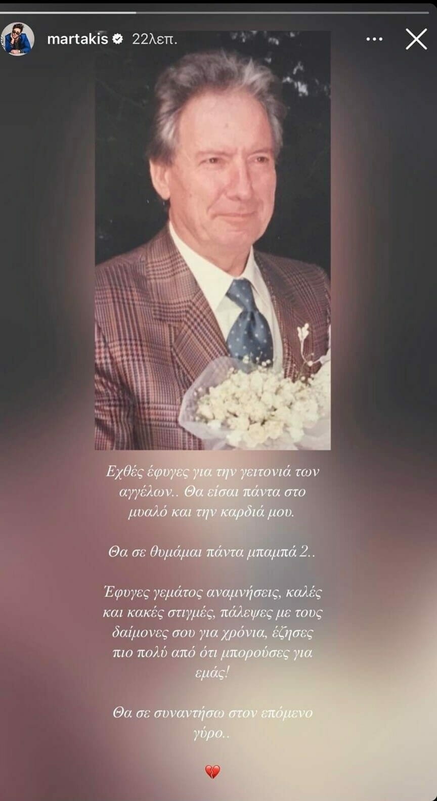 «Χθες έφυγες για τη γειτονιά των αγγέλων. Θα είσαι πάντα στο μυαλό και την καρδιά μου. Θα σε θυμάμαι πάντα μπαμπά 2… Έφυγες γεμάτος αναμνήσεις, καλές και κακές στιγμές, πάλεψες με τους δαίμονές σου για χρόνια, έζησες πιο πολύ από ότι μπορούσες για εμάς. Θα σε συναντήσω στον επόμενο γύρο» έγραψε ο Κώστας Μαρτάκης.