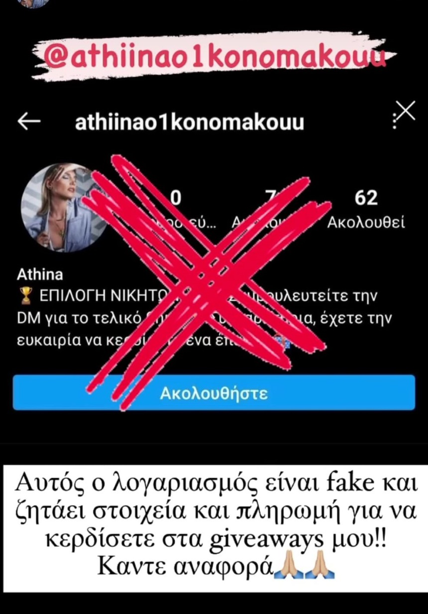 Η ηθοποιός αποκάλυψε μέσα από τον επίσημο λογαριασμό της στο Instagram ότι κάποιοι έφτιαξαν ένα ψεύτικο προφίλ προκειμένου να παραπλανούν τους ανθρώπους με τους διαγωνισμούς και να παίρνουν τα τραπεζικά στοιχεία τους. Κι όλα αυτά χρησιμοποιώντας το όνομα και τις φωτογραφίες της Αθηνάς Οικονομάκου.