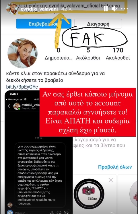 Αυτή τη φορά στο στόχαστρο επιτήδειων φαίνεται πως μπήκε η Ευρυδίκη Βαλαβάνη. Η δημοσιογράφος αφού έμαθε για την ύπαρξη του ψεύτικου λογαριασμού ζήτησε από τους ακόλουθούς τους να κάνουν αναφορές προειδοποιώντας τους να είναι πολύ προσεκτικοί.