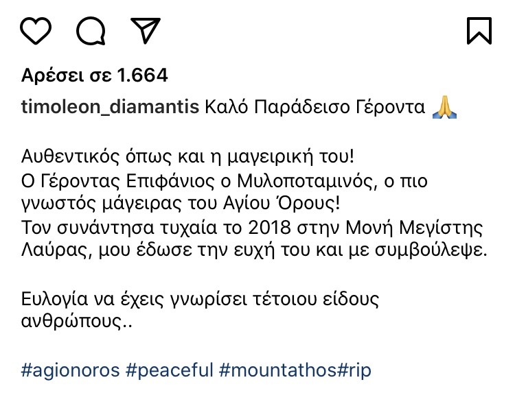 Ο Έλληνας Master Chef Τιμολέων Διαμαντής, εκτιμούσε πάρα πολύ τον Γέροντα Επιφάνιο τον Μυλοποταμινό, που ασκήτευε στην μονή Μεγίστης Λαύρας στο Άγιο Όρος. Ήταν ο καλύτερος μάγειρας στο όρος Άθως και είχε καταφέρει να πάρει την ευχή του και να ακούσει τις συμβουλές του όταν τον είχε επισκεφτεί το 2018.