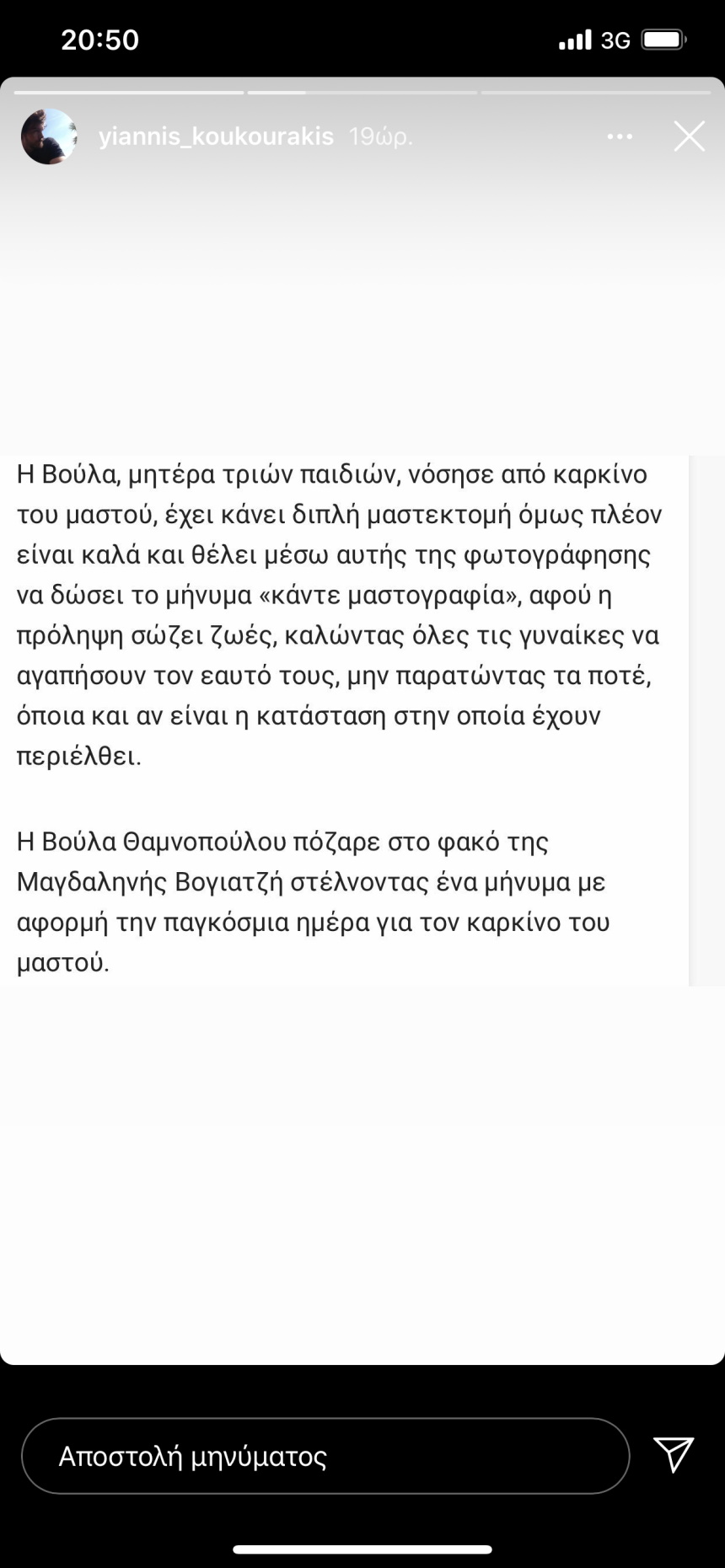 Η ιστορία μιας γυναίακς αλλά και το ηχηρό μήνυμα της στη μάχη με τον καρκίνο του μαστού, άγγιξαν τον πρωταγωνιστή από τις Άγριες Μέλισσες, Γιάννη Κουκουράκη, ο οποίος ανήρτησε στον προσωπικό του λογαριασμό στο Instagram τη φωτογραφία της και την περιπέτεια της με την ασθένεια.