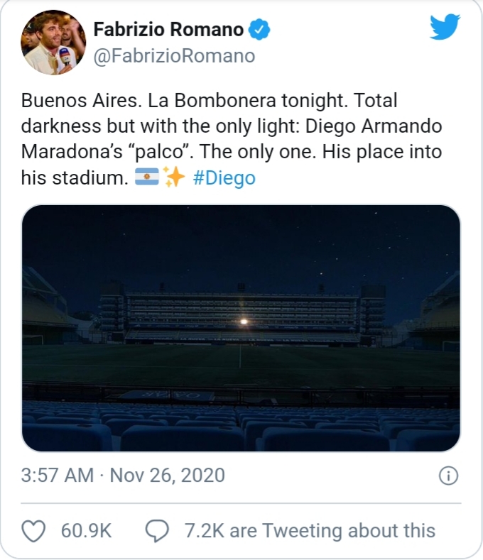 Η διοίκηση της Μπόκα έριξε στο απόλυτο σκοτάδι την ιστορική της έδρα, αλλά άφησε μόνο ένα φως ανοιχτό. Αυτό που βρίσκεται στην θέση που κάθονταν ο Μαραντόνα, όταν πήγαινε για να δει ως οπαδός την αγαπημένη του ομάδα.