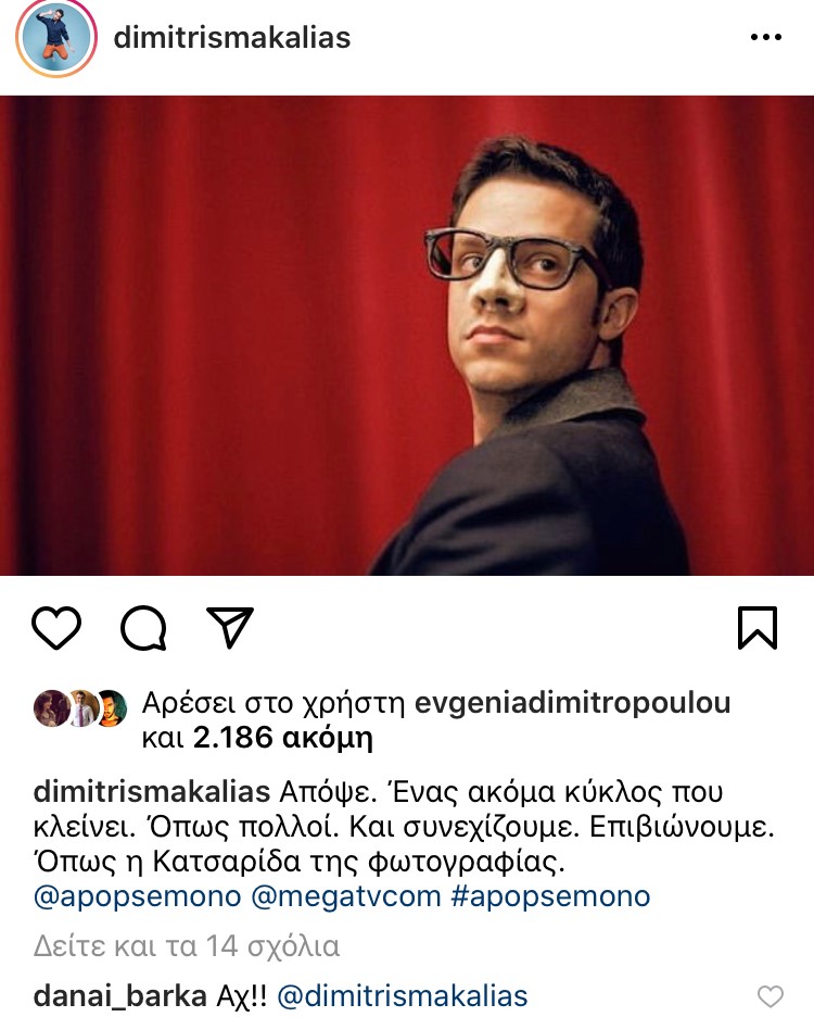Ο Δημήτρης Μακαλιάς από την πλευρά του έκανε μια δημοσίευση στο Instagram σχολιάζοντας: «Απόψε. Ένας ακόμα κύκλος που κλείνει. Όπως πολλοί. Και συνεχίζουμε. Επιβιώνουμε. Όπως η Κατσαρίδα της φωτογραφίας.»