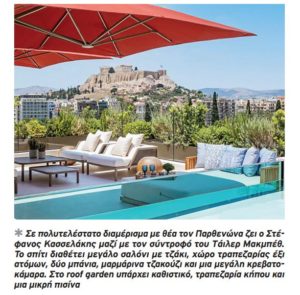 Όσον αφορά το roof garden με την ανεπανάληπτη θέα, υπάρχει καθιστικό, τραπεζαρία κήπου και μια μικρή πισίνα για βουτιές. Τι βλέπει από εκεί το ζεύγος Κασσελάκη; Τον Παρθενώνα, τους Στύλους του Ολυμπίου Διός, τον Λυκαβηττό, την Πνύκα, το Ζάππειο, τον Εθνικό Κήπο και φυσικά τον Σαρωνικό…