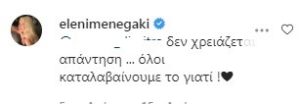 «Δεν χρειάζεται απάντηση … όλοι καταλαβαίνουμε το γιατί!», έγραψε χαρακτηριστικά η Ελένη Μενεγάκη.
