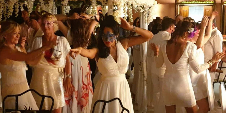 Oι αστακομακαρονάδες και οι σαμπάνιες είχαν την τιμητική τους, ενώ οι καλεσμένοι, που, ως επί τω πλείστον, προτίμησαν τα λευκά, χόρευαν ασταμάτητα, ανέβαιναν στα τραπέζια. Το γλέντησαν κανονικά και με τον νόμο.